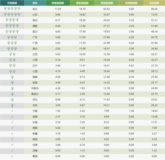 2025年度全国省域开放数林指数分值如下表所示。报告基于综合指数分值将各地的公共数据开放利用水平分为五个“开放数级”。浙江、山东综合表现最优,进入第一等级“五棵数”;贵州、福建与四川也总体表现优秀,进入第二等级“四棵数”;其次是广东、广西与湖北,进入第三等级“三棵数”。