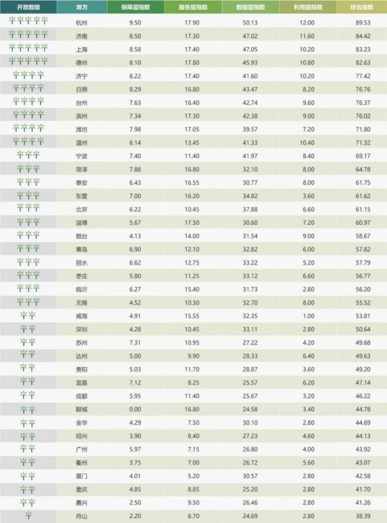 2025年度全国城市开放数林的指数分值如下表所示。报告基于综合指数分值将各地的公共数据开放利用水平分为五个“开放数级”。杭州、济南、上海与德州综合表现最优,进入第一等级“五棵数”;济宁、日照、台州、滨州、潍坊与温州也表现优异,进入第二等级“四棵数”;其次是宁波、菏泽、泰安、东营、北京、淄博、烟台、青岛、丽水、枣庄、临沂与无锡,进入第三等级“三棵数”。