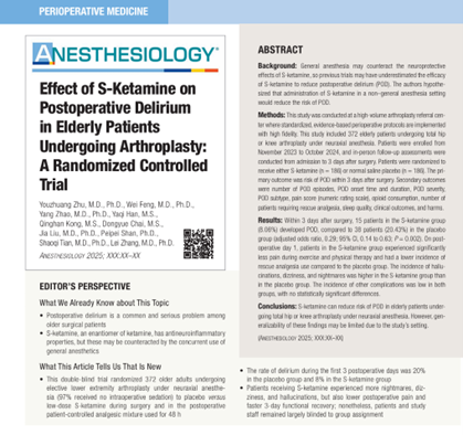 据悉,此项研究共纳入372名接受髋/膝关节置换的老年患者,其中使用艾司氯胺酮的患者仅8%出现术后谵妄,而对照组则高达20%。这一结果表明,每治疗8名患者,就能避免1例谵妄的发生。