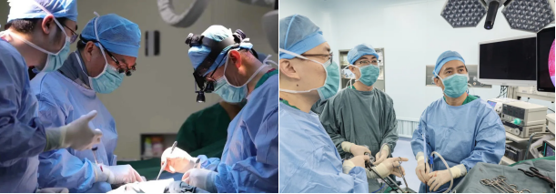 心外科(左)、胸外科(右)团队为患者进行联合手术