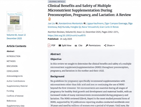 流行病学资料显示,全球育龄女性普遍存在多种微量营养素摄入不足的问题,中国亦不例外。一项发表于国际营养学权威期刊《Nutrition Reviews》的《孕前、孕期及哺乳期补充多种微量营养素的临床获益与安全性综述》(以下简称《综述》)显示:在备孕、妊娠及哺乳期女性中,通过服用多种微量营养素补充剂改善母体的微量营养素状况,可对母体生育能力、胚胎内环境完整性、胎儿大脑与神经系统发育,以及出生后婴儿的生长发育和其远期健康产生有益影响。