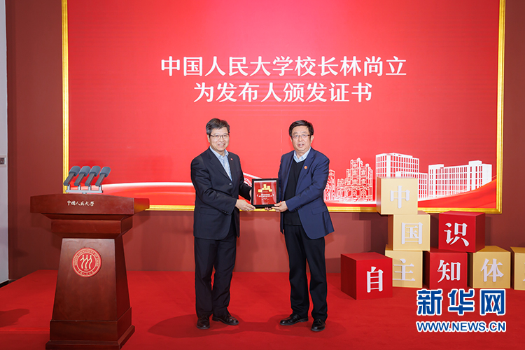 林尚立为各位发布人颁发证书。他表示,中国人民大学被誉为“我国人文社会科学高等教育领域的一面旗帜”。学校围绕“建构中国自主的知识体系”系统谋划,发布《建构中国自主的知识体系倡议书》,倡议组建“建构中国自主的知识体系大学联盟”,从2023年开始每季度召开“中国自主的知识体系成果发布会”,携手兄弟高校、媒体单位,共同为助力中国特色哲学社会科学真正屹立于世界学术之林贡献力量。我们期待一同将自主知识体系成果发布会打造成党的创新理论的研究高地、示范园地、传播基地,引导和支持广大哲学社会科学工作者立时代之潮头、通古今之变化、发思想之先声,勇于结合新的实践不断推进理论创新,善于用新的理论指导新的实践,让马克思主义在中国大地上展现出更强大、更有说服力的真理力量。