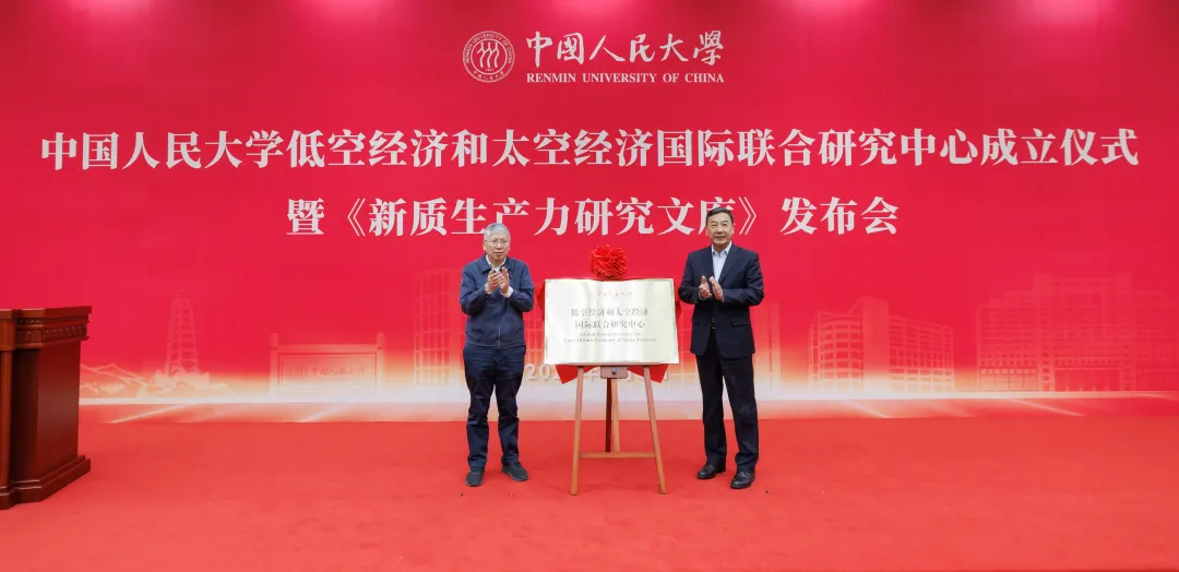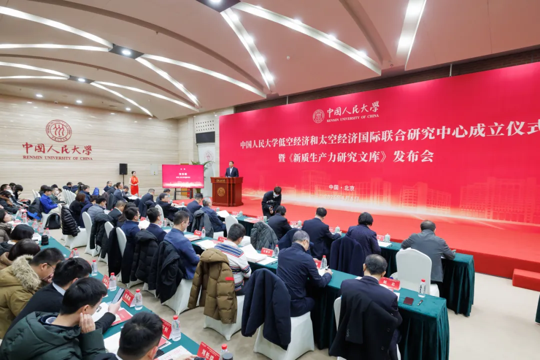 中国人民大学低空经济和太空经济国际联合研究中心成立仪式暨《新质生产力研究文库》发布会由中国人民大学主办,中国人民大学习近平新时代中国特色社会主义思想研究院、新质生产力研究中心、出版社等承办。校内各职能部门、相关学院主要负责同志,《新质生产力研究文库》作者和青年教师代表等参加发布会。