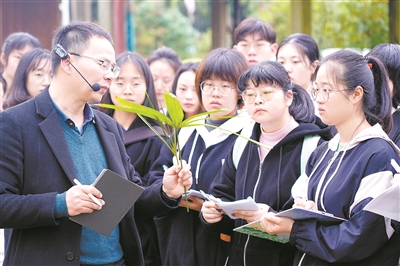 “园林绿化养护劳动实践”课上,学生们跟高级农艺师仇智灵学习植物病虫害防治知识,辨认不同植物遭受不同病虫害后的特征差异。