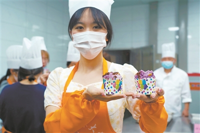 “大学生烹饪基础教育与实践”课上,大二学生项诗瑶展示自己亲手制作的纸杯发糕。她说,要把自己完成的这份“作业”带回寝室,与同学们一起分享。