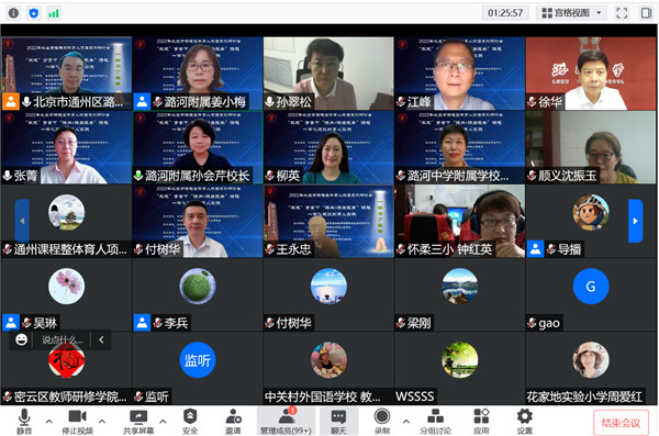 2022年6月28日由北京市教科院基础教育课程教材发展研究中心、北京市教育学会课程发展专委会主办、通州区教委和研修中心协办、潞河中学附属学校承办的北京市课程整体育人《“双减”背景下“课内+课后服务”课程一体化建设的育人实践》研讨会以“云端会议”和“网络直播”的方式顺利召开。出席会议的领导有北京市教科院基础教育课程教材发展研究中心课程二室主任、北京市课程整体育人项目负责人江峰,通州区教委副主任付树华、小教科科长翟柳英等,首都师范大学教育学部博士生导师张菁,西城教育学院副院长王素敏,通州区研修中心课程办苗绮云、闫月,潞河中学教育集团校长徐华等。