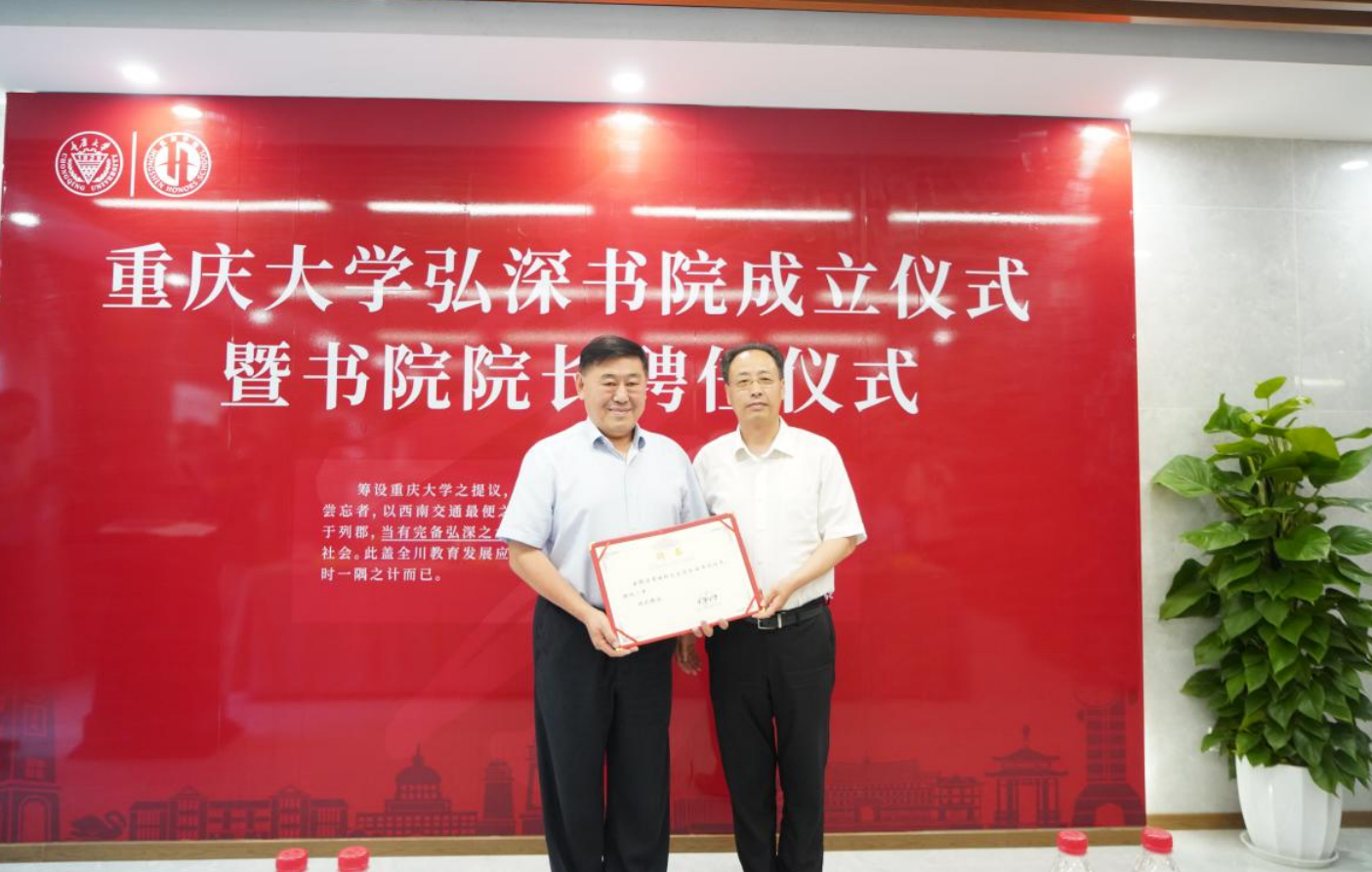 “弘深书院”命名源自1929年《国立重庆大学筹备会成立宣言》“当有完备弘深之大学一所”,其寓意弘深学子“弘德博学,深思笃行,报效国家”。仪式上,王树新为周绪红颁发弘深书院院长聘书。