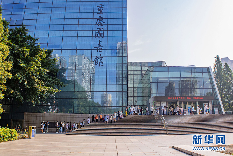 图为市民在重庆图书馆开馆前就排起了长队,等待进入。新华网发(孙凯芳 摄)