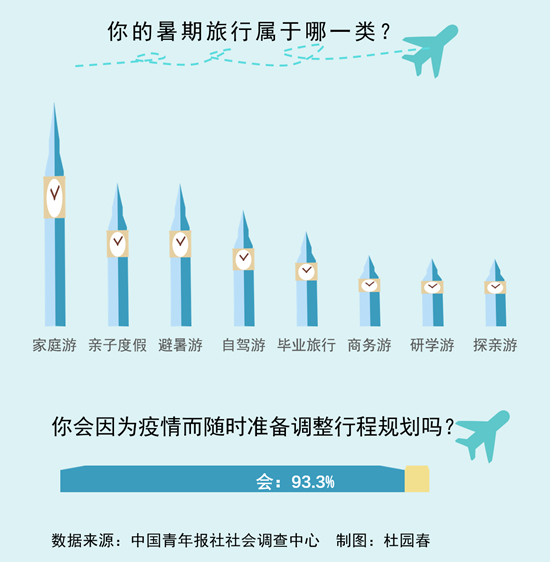 上周,中国青年报社社会调查中心联合问卷网(wenjuan.com),对2004名受访者进行的一项调查显示,家庭游、亲子度假、避暑游是人们暑期出游的主要需求。56.6%的受访者表示疫情得到有效防控提高了出行信心。93.3%的受访者明确会因疫情防控随时准备调整行程规划。
