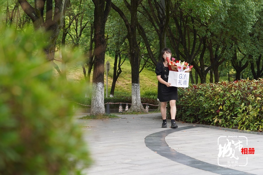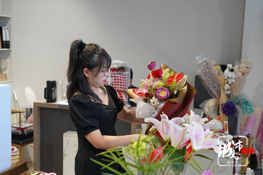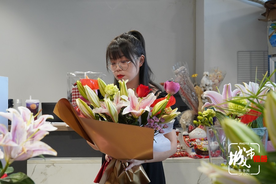 汪林今年36岁,初见时,她扎着高马尾,正在包装花束。一把剪刀,一卷胶带,在她手上不到半小时,鲜花就变成了漂亮的花束。新华网 朱清 摄 陈雨 阳书琴(实习生)文