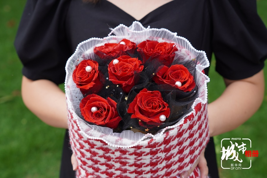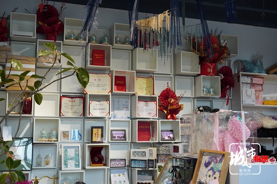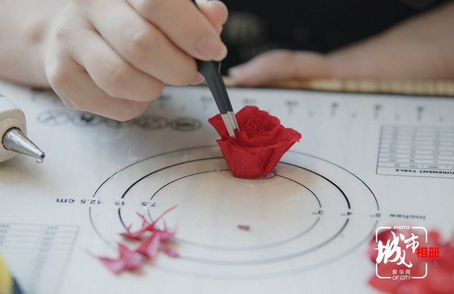 不断学习插花技艺的过程中,汪林还开始研究制作永生花,即通过脱水、保鲜、上色等方式,让鲜花不凋谢。汪林还尝试将鲜花制成各种手工艺品,例如,蓝牙音箱花、台灯花、头饰、耳饰等。新华网 朱清 摄 陈雨 阳书琴(实习生)文