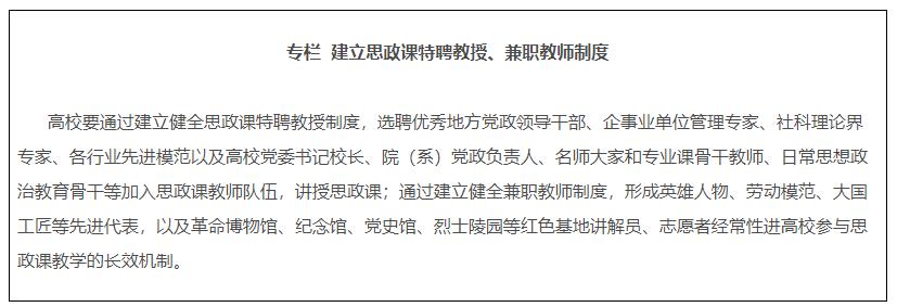 《方案》提出要建设专兼结合的师资队伍,提高中小学专职思政课教师比例,各地教育部门要建立中小学思政课教师轮训制度。各地各高校建立专门制度,常态化支持思政课骨干教师到各级宣传、教育等党政机关或基层挂职锻炼、蹲点调研,相关经历纳入评奖评优、干部选聘体系,相关成果作为职称评聘参考。