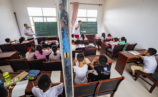 8月24日,东咀村小葵花少年宫教室里,来自陕西学前师范学院青年扶志实践队的支教老师姚丁鸣(左)、张一琛(右)分别给孩子们进行课业辅导。袁景智/摄