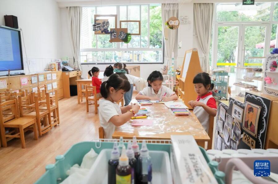 9月1日,在上海市徐汇区科技幼儿园,孩子们在教室内画画。