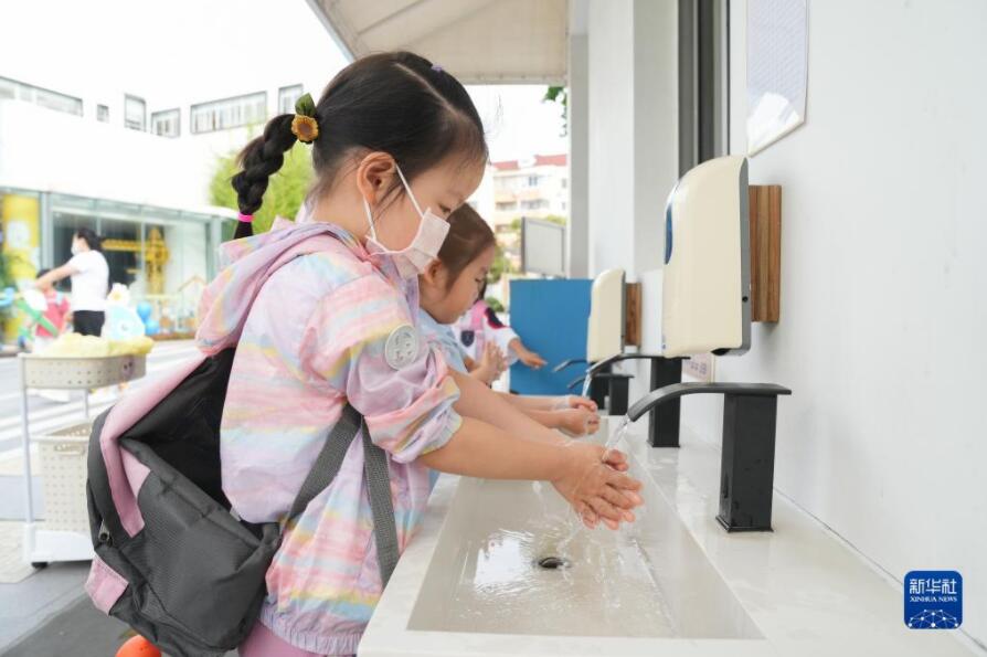 9月1日,在上海市徐汇区科技幼儿园,孩子们在水池前洗手。