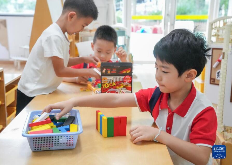 9月1日,在上海市徐汇区科技幼儿园,孩子们在教室内玩玩具。