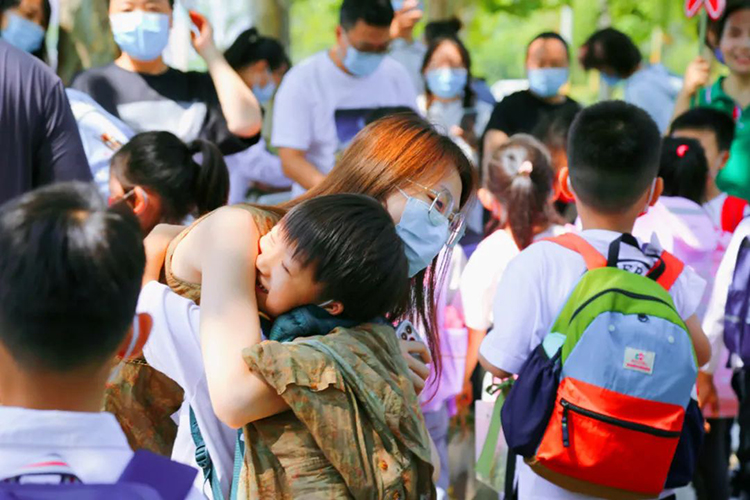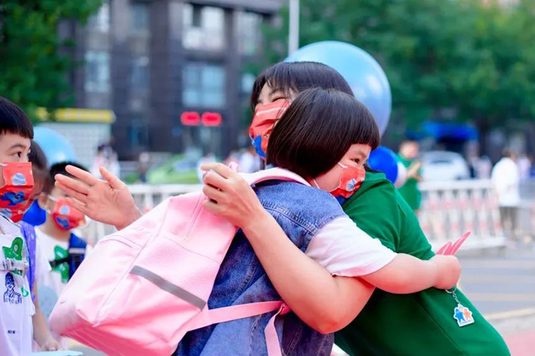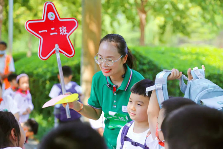 放学了,班主任老师带领孩子们走出校园,把孩子送到爸爸妈妈的手里。在一声声温暖的“再见”中,第一天的小学生活结束。