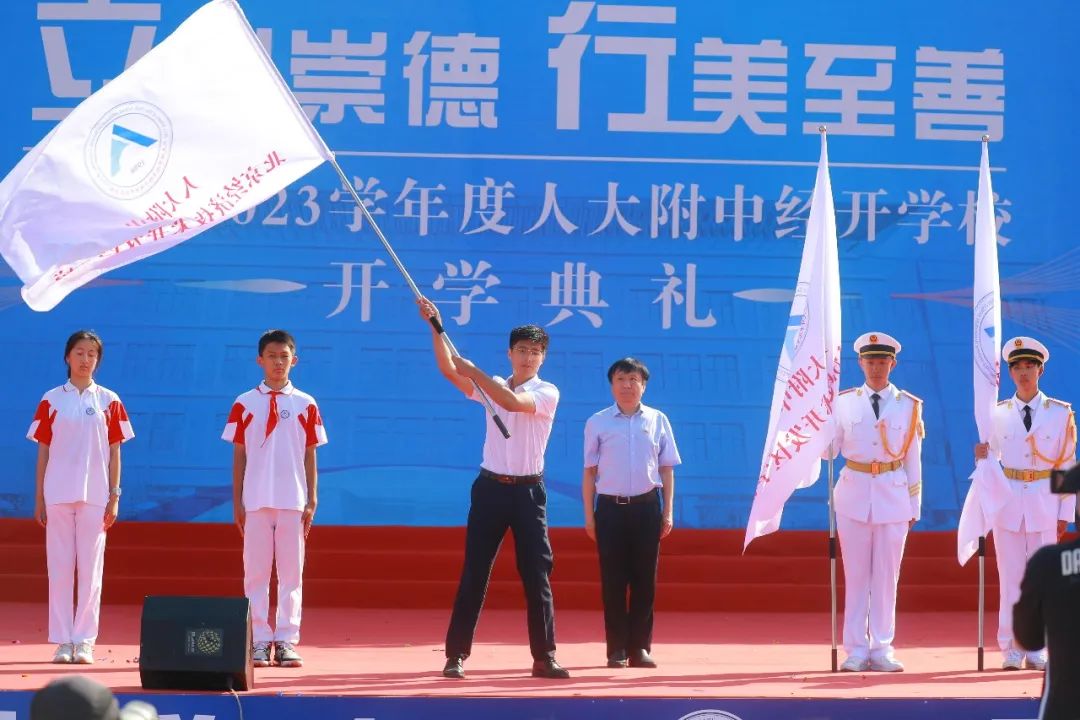 授旗仪式上,经开区社会事业局王雪青副局长为新一年级、新初一、新高一代表授旗。授旗仪式作为责任感和仪式感的传递,四面旗帜代表了学校对同学们的殷切希望和祝福,引领每位同学在未来的学习生活中,拼搏进取,勤奋学习,快乐成长,以自己的全面成长为校旗争光添彩。