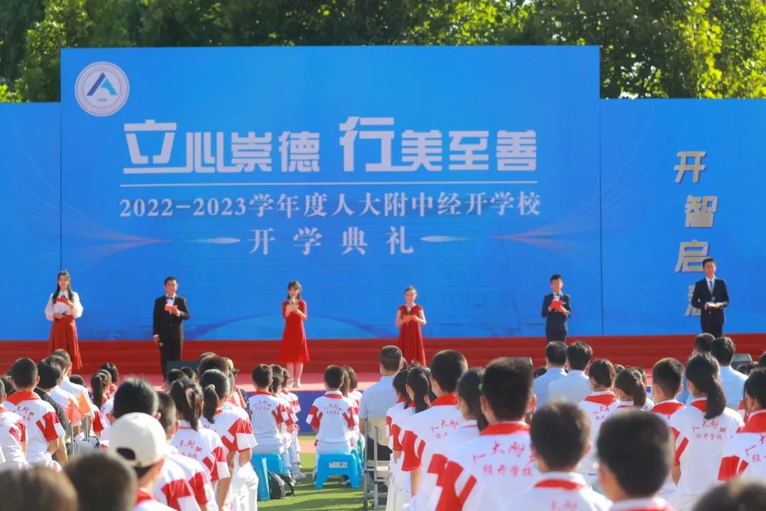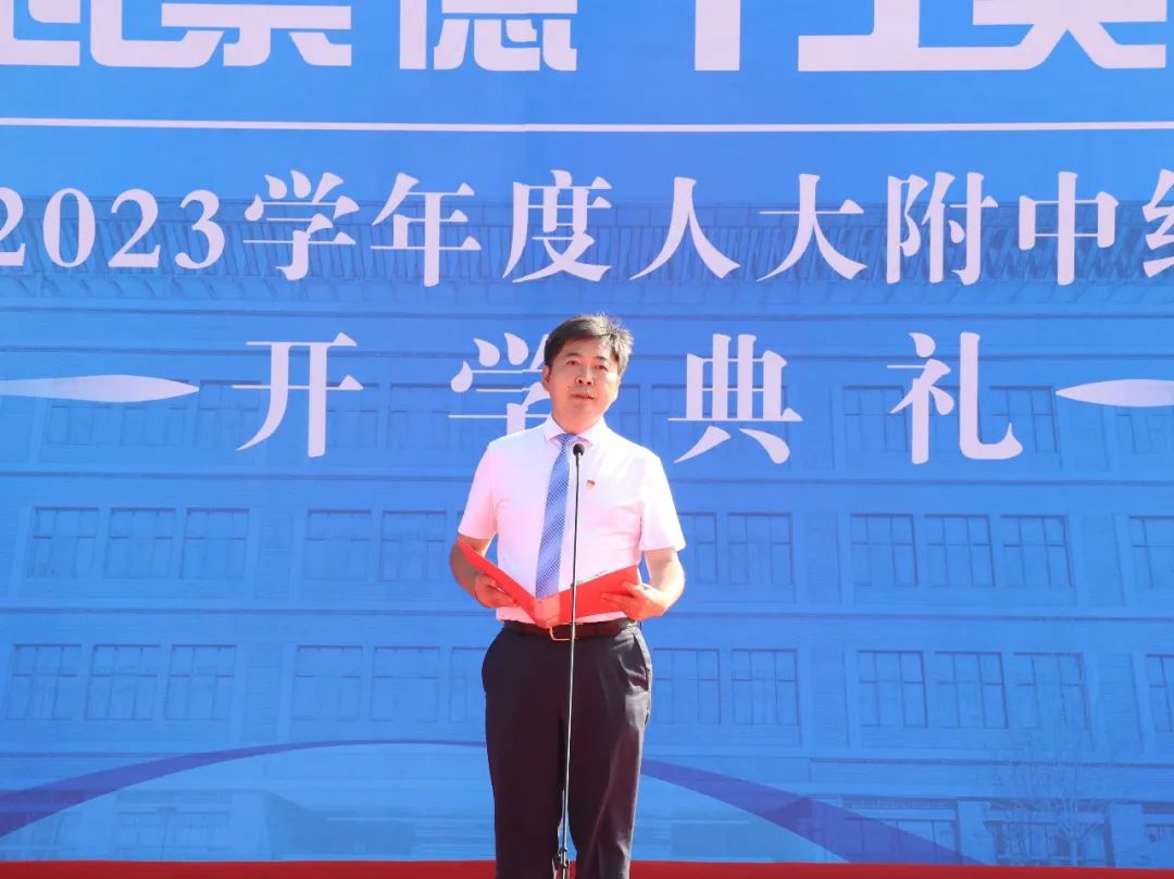 站在经开区建区30周年的发展节点上,王教凯校长发表致辞,他向一直以来关心和支持人开的领导、家长和各界朋友们表示真挚的感谢,他深情回顾了人开的发展故事,并号召老师们立仁心,立匠心,立公心,全心全意培养祖国栋梁。他和同学们分享了红蓝白三种人开颜色的内涵和深意,并提出了对大家的新学年期待: