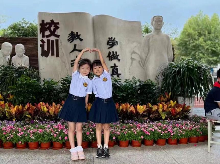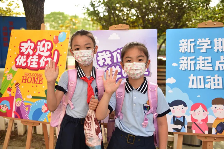 上海市长宁区绿苑小学的“姐妹花”和老师们招手,久别重逢,学生对新学期充满了希望,校园里也因此充满了活力。