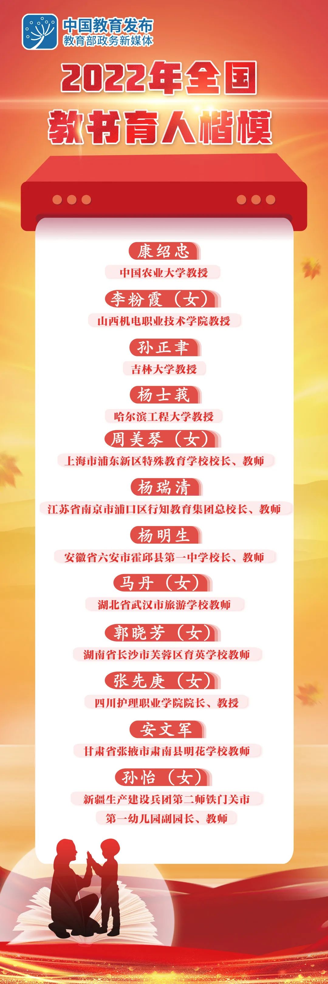 经中央领导同志批准,今年5月,中宣部、教育部对全国教书育人楷模学习宣传活动作出部署。今年,共评选出12位全国教书育人楷模,名单如下↓↓↓