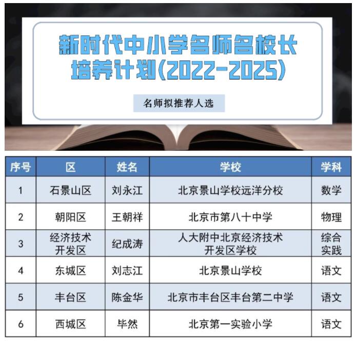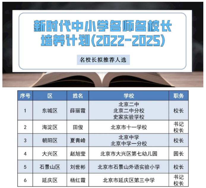 日前,北京市教委根据《教育部办公厅关于实施新时代中小学名师名校长培养计划(2022-2025)的通知》要求,经基层推荐、专家评审,拟确定新时代中小学名师名校长培养计划(2022-2025,简称“双名计划”)名师和名校长推荐人选各6人。