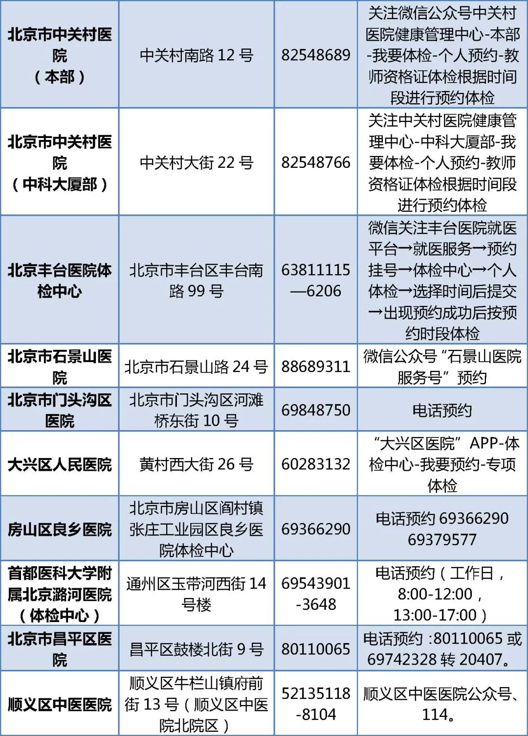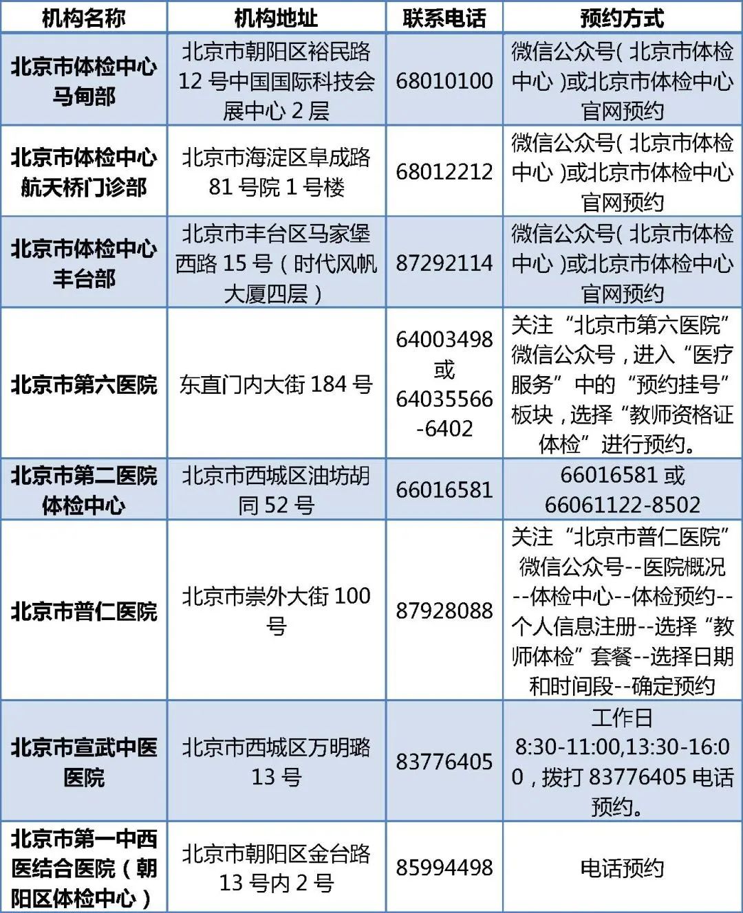 北京市教师资格认定体检机构名单