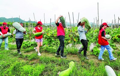 在江西省萍乡市安源区城郊管委会里善村蔬菜种植基地,大学生和菜农一起采摘冬瓜、南瓜。李桂东摄/光明图片