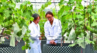 上海交通大学“国瑞葡——中国鲜食葡萄栽培新模式”项目成员在果园里工作。光明图片