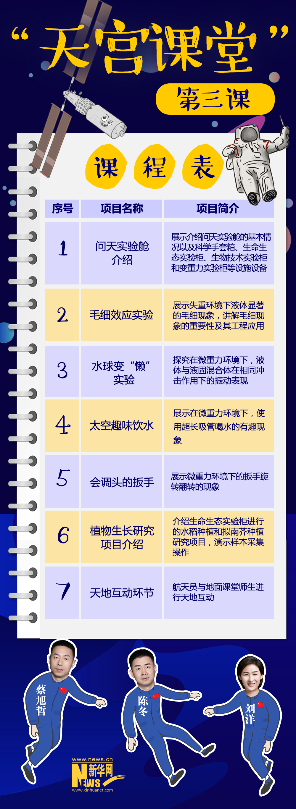 “天宫课堂”第三课定于10月12日下午15时45分开始,神舟十四号飞行乘组航天员陈冬、刘洋、蔡旭哲将面向广大青少年进行太空授课,中央广播电视总台将面向全球进行现场直播。