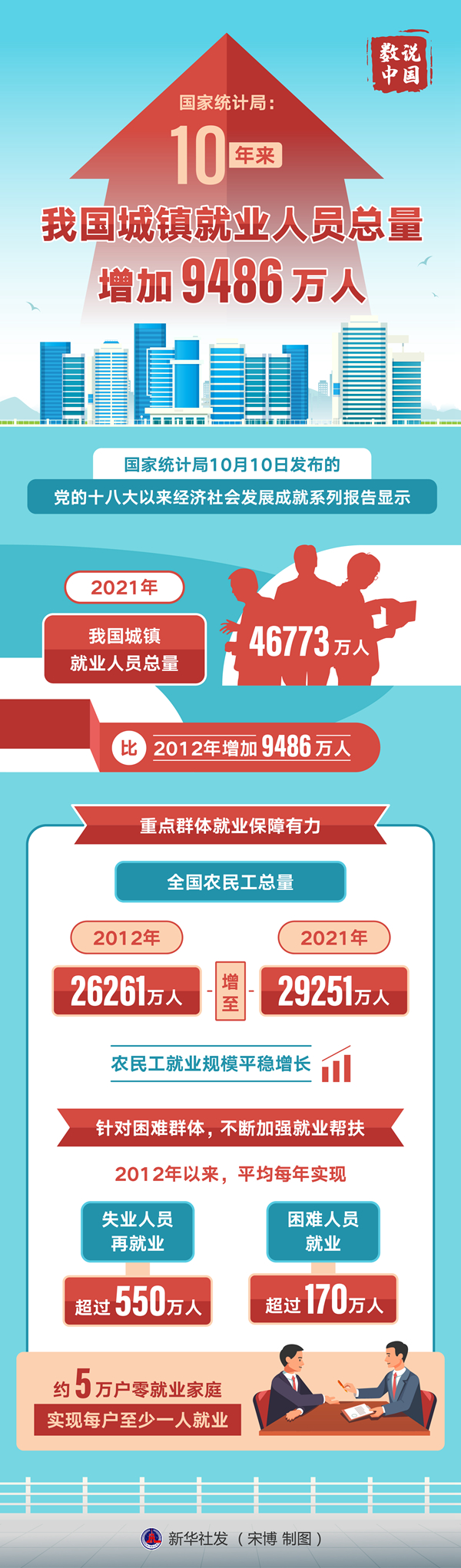 新华社北京10月10日电(记者魏玉坤)国家统计局10日发布的党的十八大以来经济社会发展成就系列报告显示,2021年,我国城镇就业人员总量达到46773万人,比2012年增加9486万人。