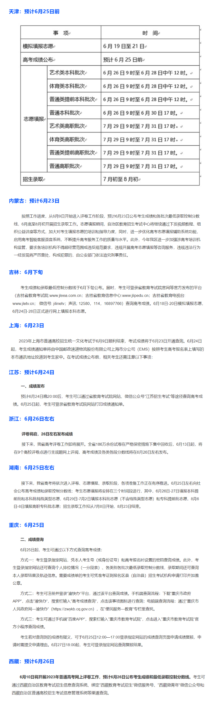 预计6月24日中午公布成绩并开始第一次集中志愿填报工作