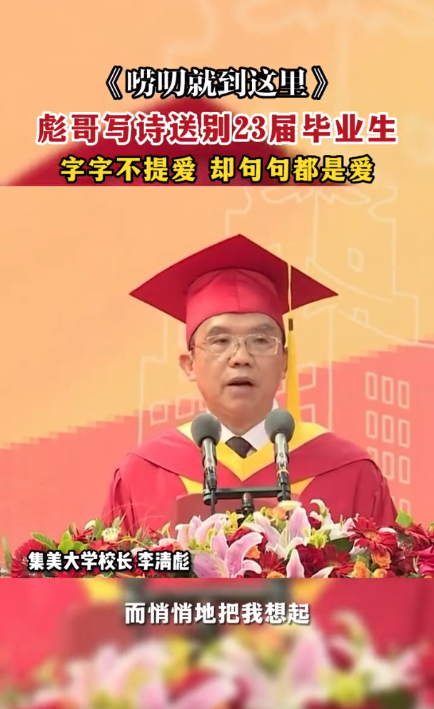 6月9日,集美大学毕业典礼上,校长李清彪用诗送别毕业生。“四年的唠叨,你们记住了几许?若干年后,无论挫折与顺利,你们能否因为过往的唠叨,而悄悄地把我想起。”网友们看后纷纷泪奔表示:让我们最后再听一次校长的唠叨吧!