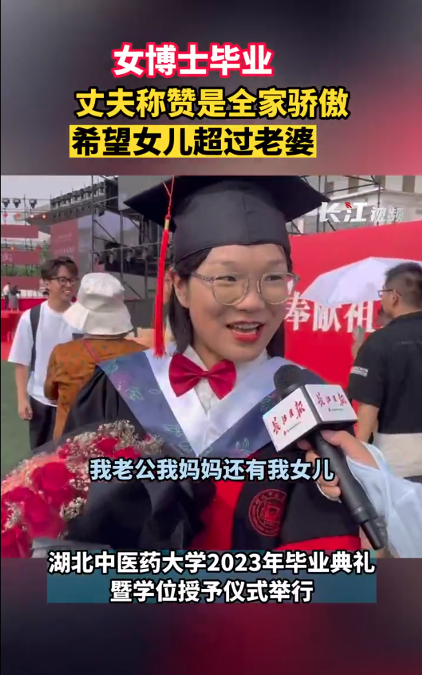 毕业典礼上,家人的陪伴和祝福也格外珍贵。6月12日,湖北中医药大学2023年毕业典礼暨学位授予仪式举行。一名女博士毕业,丈夫和女儿也来参加她的毕业典礼。丈夫称赞女博士是全家的骄傲,希望女儿超过老婆。网友们被这温馨的一幕触动,纷纷送上祝福表示:爸爸妈妈做好榜样,孩子一定会更优秀!