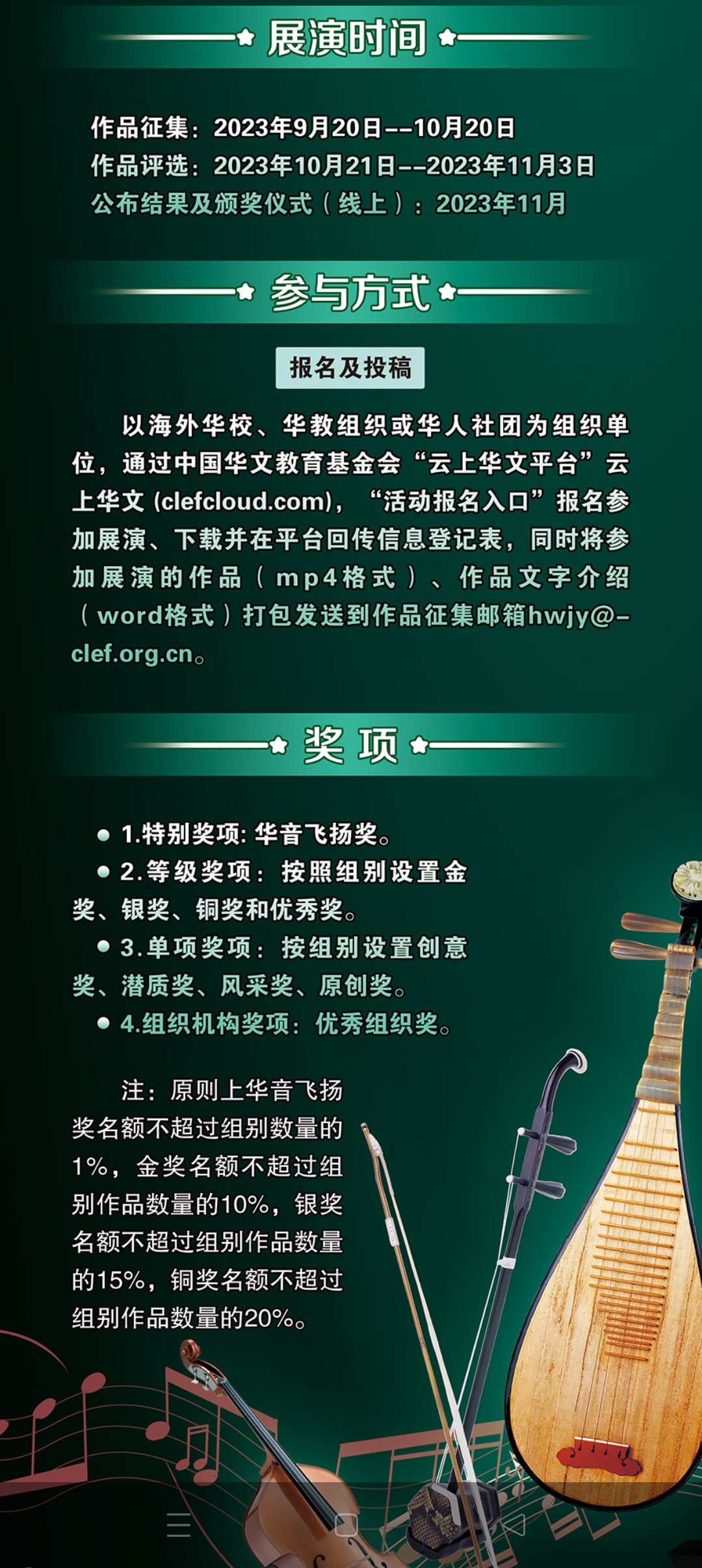 华裔青少年器乐展演活动主要面向海外7至18岁华裔青少年,以海外华校、华教组织或华人社团为组织单位,通过中国华文教育基金会“云上华文平台”云上华文 (clefcloud.com),“活动报名入口”报名参加,本届展演活动赛程近三个月,主办方欢迎海外华裔青少年积极参与!详情请关注中国华文教育基金会“云上华文平台”。