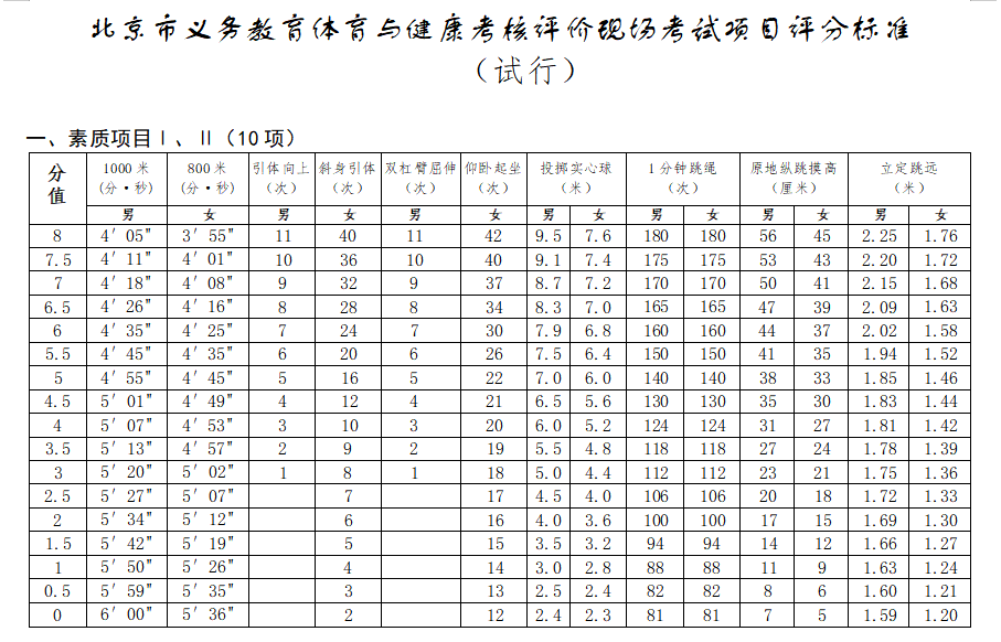 北京市义务教育体育与健康考核评价现场考试项目评分标准(试行)点击下载