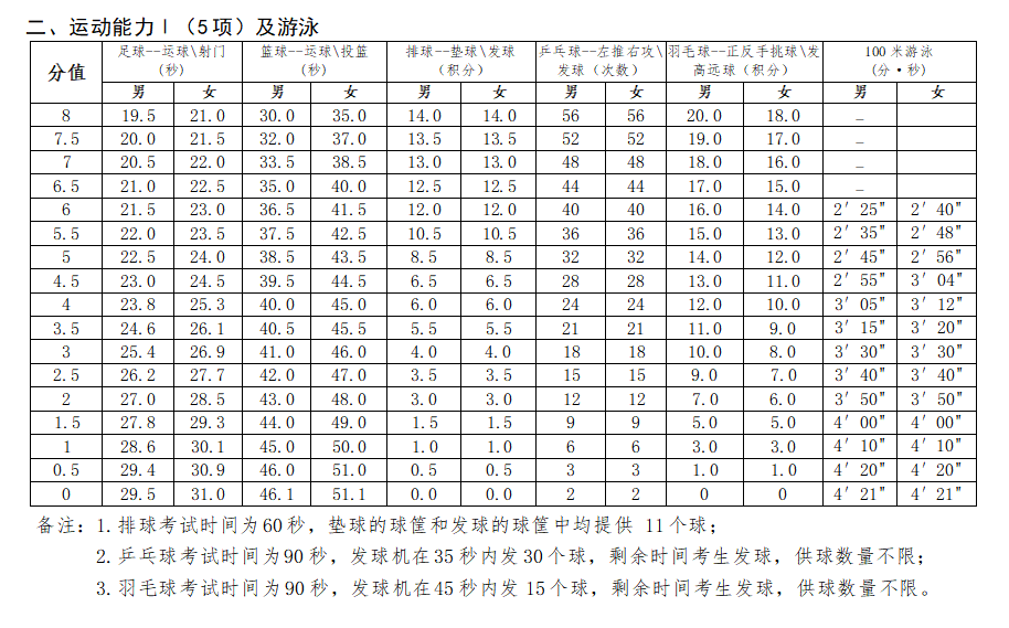 据介绍,对照原来体育中考现场考试项目,在此次评分标准的制定上,一方面科学调整了原有项目标准,包括男生1000米、女生800米、引体向上、仰卧起坐、实心球5个项目,其中男生1000米、女生800米、引体向上、仰卧起坐4个项目也是《国家学生体质健康标准(2014年修订)》的测试项目。在全面分析2017年以来体育中考、抽测、统测数据基础上,对照国家学生体质健康标准,按照“达到良好即满分”的原则进行调整。另一方面科学制定新增项目标准,新增的17个项目,也按照“达到良好即满分”的原则,参考《国家体育锻炼标准》、其他省市中考体育相关标准、实证数据分析和专家论证意见制定。新增项目难度不高于原有项目。