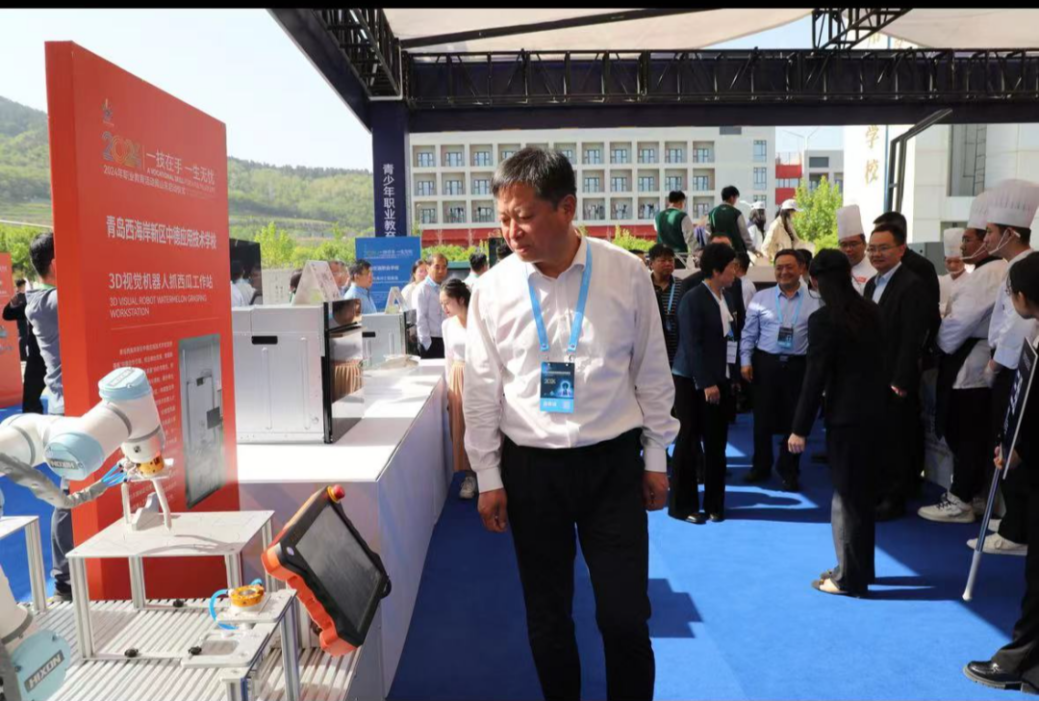 今年山东职业教育活动周启动仪式特别设置了青少年职业教育展示体验活动,青岛西海岸新区中德应用技术学校的3D视觉机器人现场精彩演示了抓西瓜的操作,展示了无序抓取技术和3D测量技术在农业领域的应用,利用该技术可以随机抓取汽车零部件等工业零部件,也可以做到像人一样从树上摘苹果,同时测量产品是否尺寸合格。