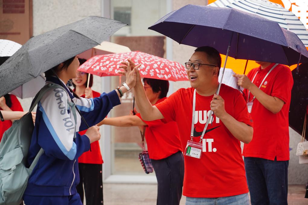 6月7日,北京一零一中学的送考老师们在校门口为考生加油鼓劲。(北京一零一中学供图)