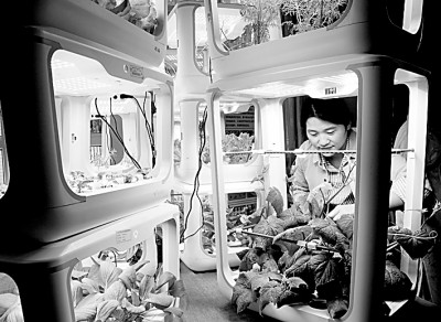 2023年5月13日,上海职业教育活动周,上海农林职业技术学院的教师展示智能种植箱里的绿植。 新华社发