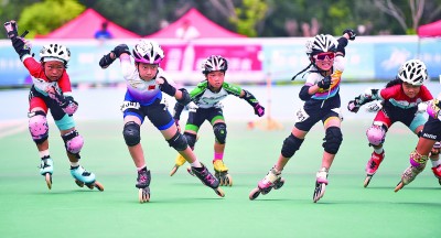河南洛阳,小朋友们在体育公园内参加速度轮滑友谊赛。新华社发
