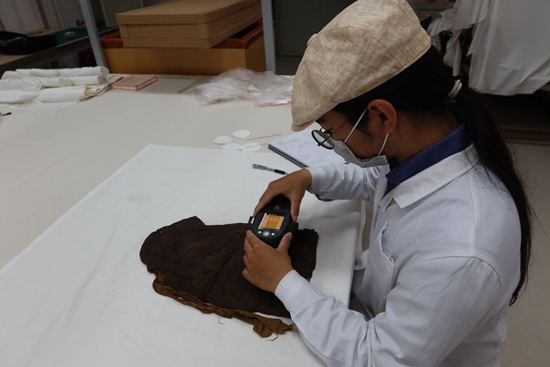 张沐旸测量文物服饰颜色。受访者供图