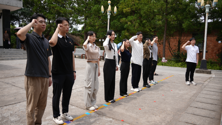 图为支队成员在邓稼先旧居前重温入党誓词