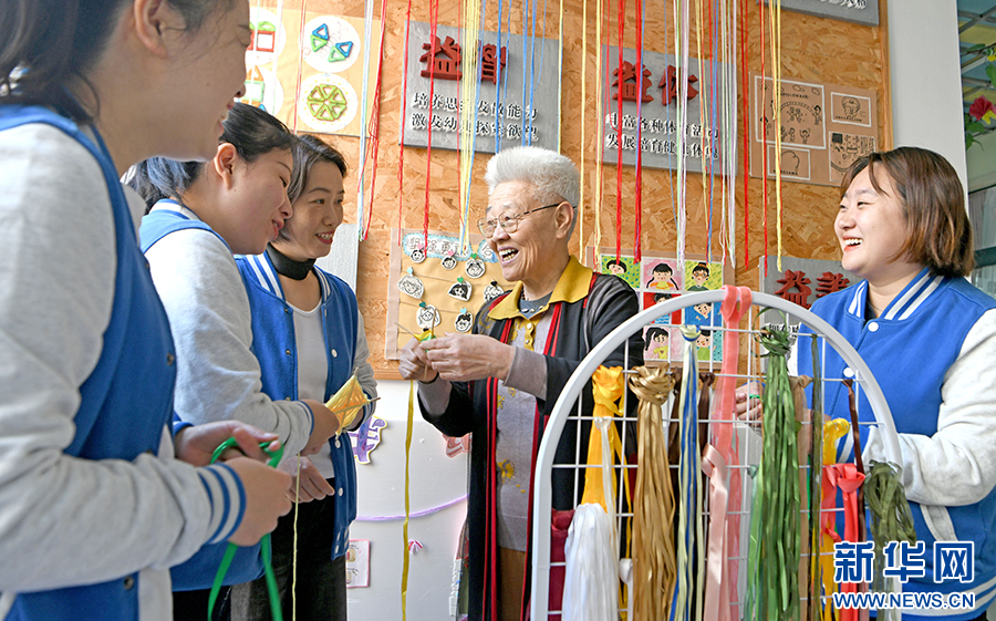 10月9日,杨维云回到以前工作过的锦程幼儿园,与青年教师交流手工制作。