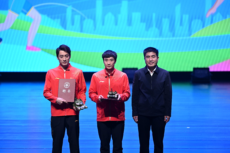 北京理工大学副校长李振键向曹缘、练俊杰颁发了学生领军导师(体育类)聘书并赠送北京理工大学纪念品。
