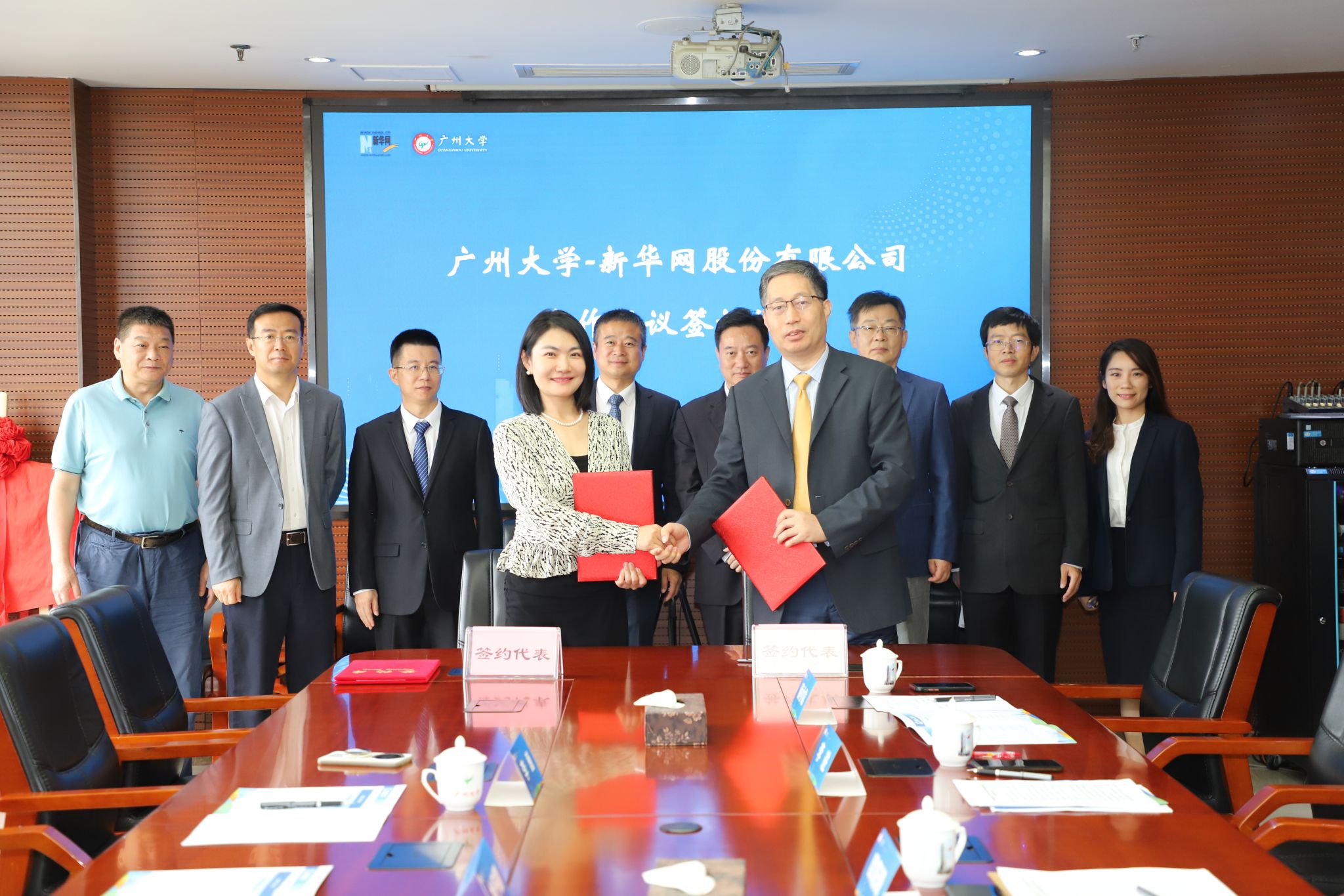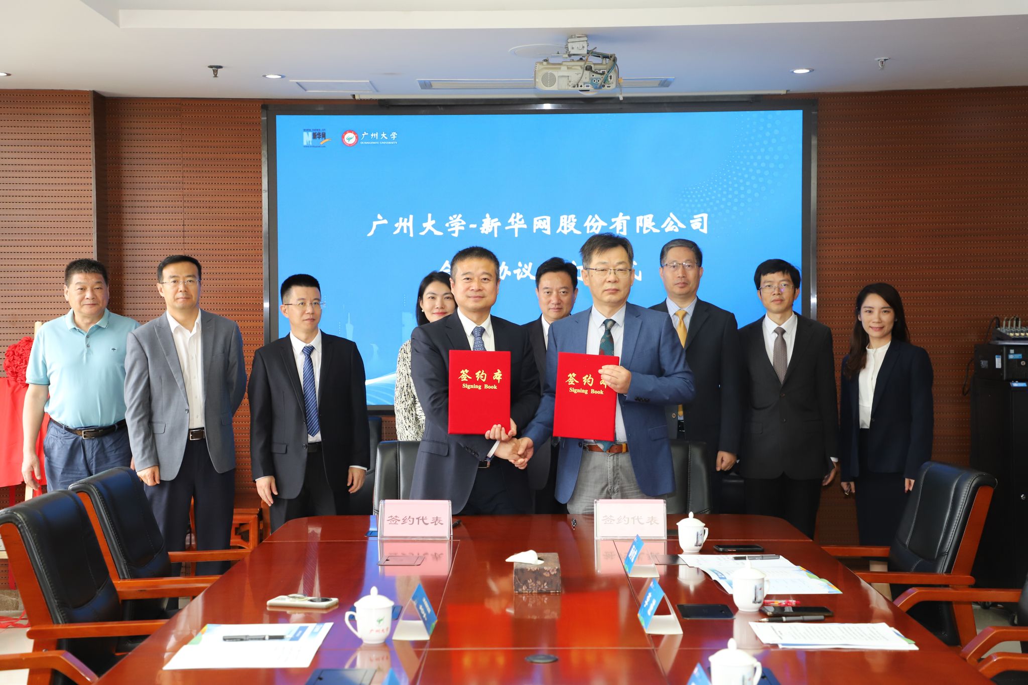 广州大学管理学院院长薛小龙、新华网党建部主任李巍共同签订“新华网股份有限公司广州大学共建数字经济实验室合作协议”。