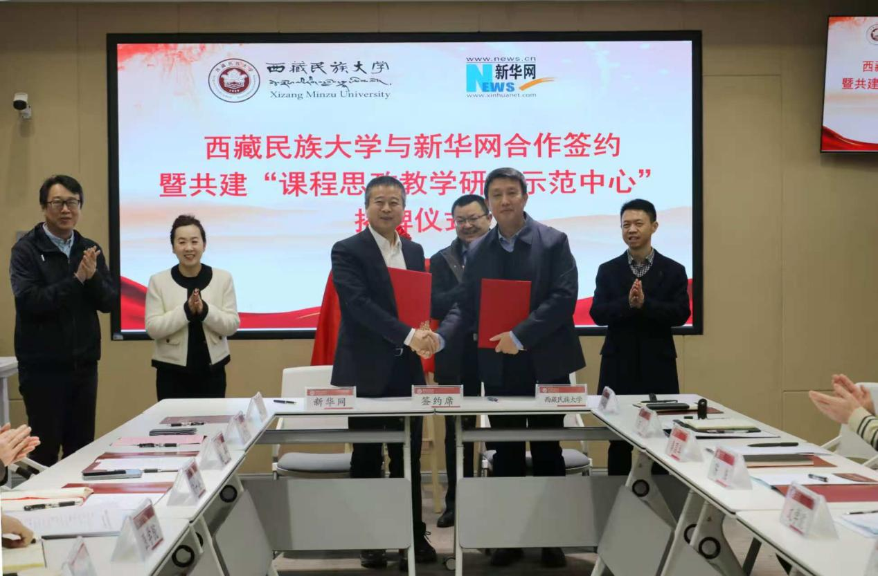 仪式上,王浩与姚予疆共同签署了《西藏民族大学与新华网共建课程思政教学研究示范中心框架合作协议》,并为“课程思政教学研究示范中心”揭牌。