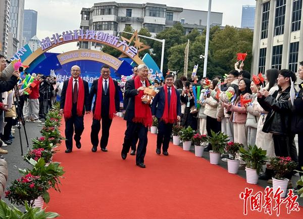 一条近百米的红毯从马路一侧延伸至会场,10位院士、专家戴着红色围巾,一一走过。红毯两侧,鲜花簇拥,挥舞“追星牌”的粉丝团掌声如潮。这是1月6日,2025年湖北省科技创新大会特别环节——“院士专家走红毯”的现场。