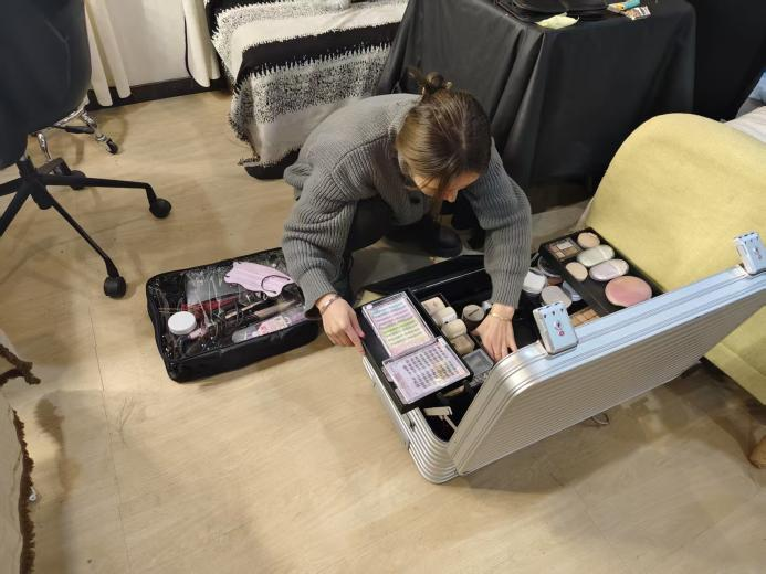 “化妆刷、水、乳液、粉扑,还有隔离、定妆、修容用品,以及各种发型工具……”魏成云反复确认着,为次日的跟妆工作做好充分准备。她微笑着说,“这个春节,我只接了五个跟妆单,想给自己留点休息时间。我的伙伴更为忙碌,几乎整个春节期间都要为新娘们跟妆。大年初六是个热门的好日子,许多新人都选择在这一天举办婚礼。”