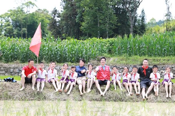 广西罗城仫佬族自治县小长安镇,监狱警察与学生们在稻田里开展校外实践活动。安林霞/摄
